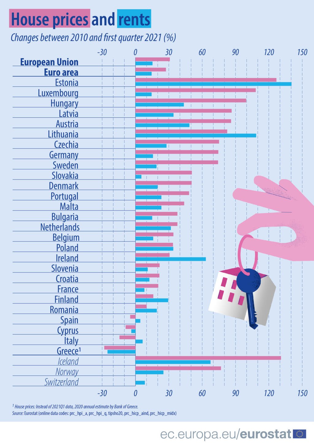 Ceny nehnuteľností určených na bývanie sa za toto obdobie zvýšili v 23 členských štátoch a klesli len v štyroch, pričom najvyšší rast bol v Estónsku (+126,8 %) a Luxembursku (+108,2 %). Pokles nastal v Grécku, Taliansku, na Cypre a Španielsku.